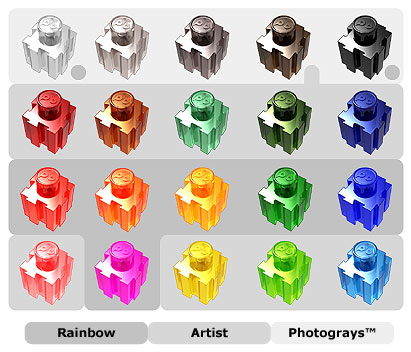 Our Photograys™ colors are arranged from light to dark, and allow the expression of subtle shading. They are Clear, Light Gray, Gray, Brown, and Black.